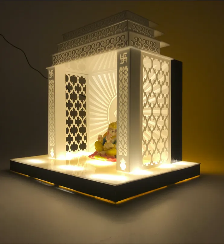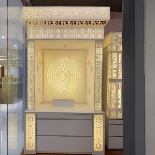 Custom-designed Corian Mandirs with intricate CNC patterns and soft backlighting, blending tradition with modern aesthetics.